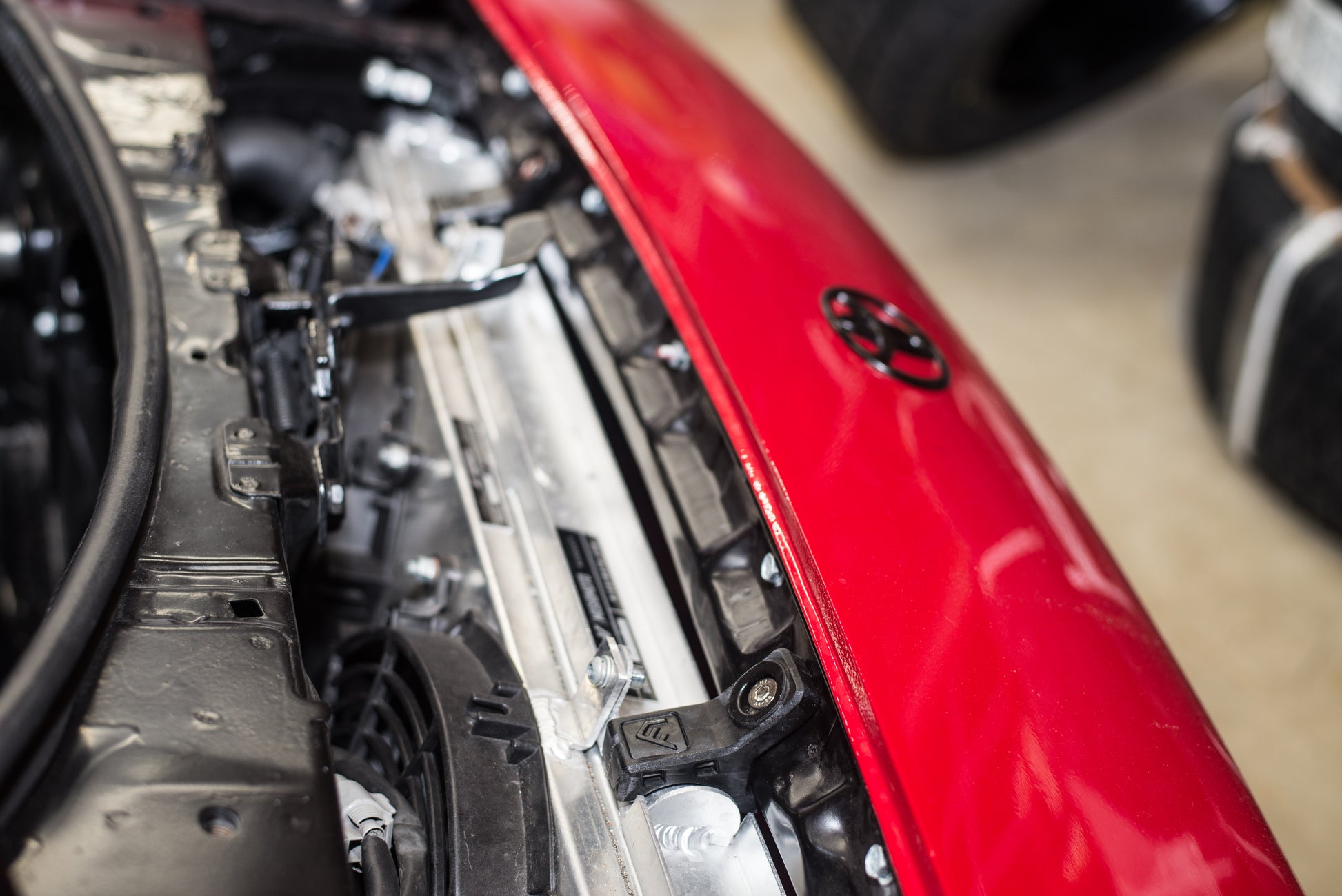 Custom radiator mount to tilt your SW20 MR2 radiator forward for better flow through vented hoods (such as Border-style or Lotus-style).
